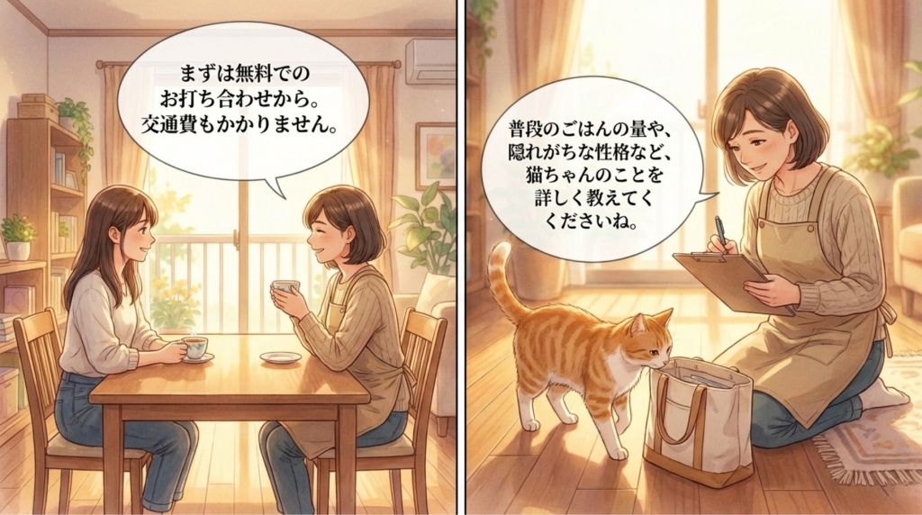 ペットシッターを初めてご利用される方にも、安心してご利用いただけるよう、無料でご相談をお受けしております。ペットの種類、年齢、性格、お留守にする期間など、どんなことでもお気軽にご相談ください。