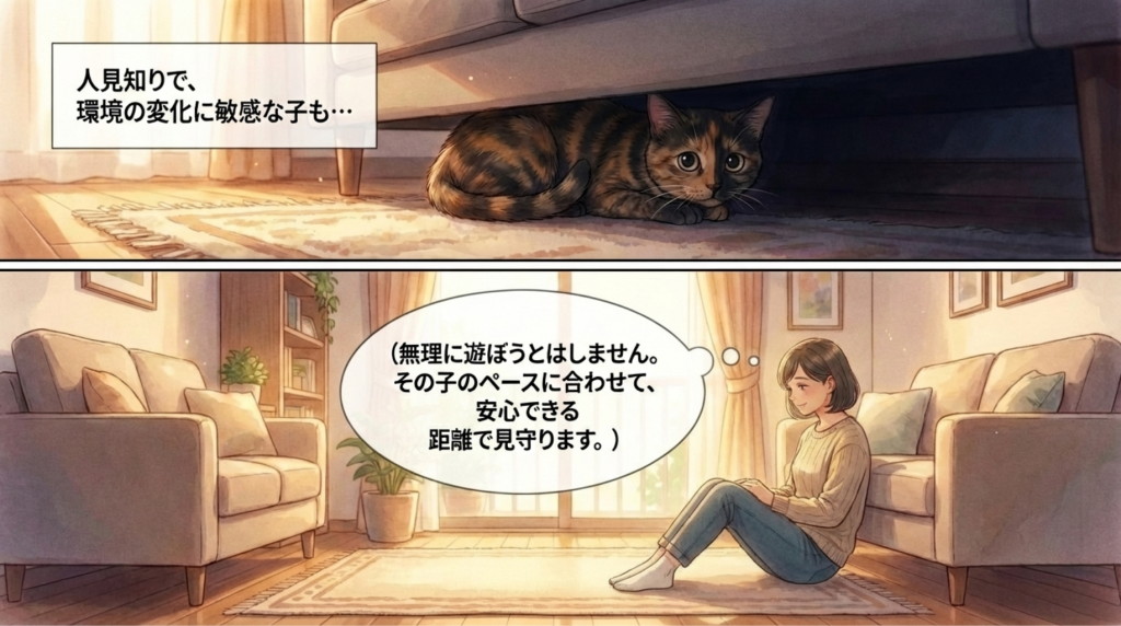 環境の変化を嫌がる猫ちゃんは、特に人見知りな子も多く、他の人の手を嫌がる場合があります。無理に遊んだりせず、静かに見守り、安心できる距離を保つことが大切です。猫が安心して過ごせるような隠れ家を用意したり、猫が好きな匂いのタオルを置いてあげたりするのも効果的です。このような猫ちゃんの気持ちを尊重し、個々の性格に合わせた丁寧なケアを行います。