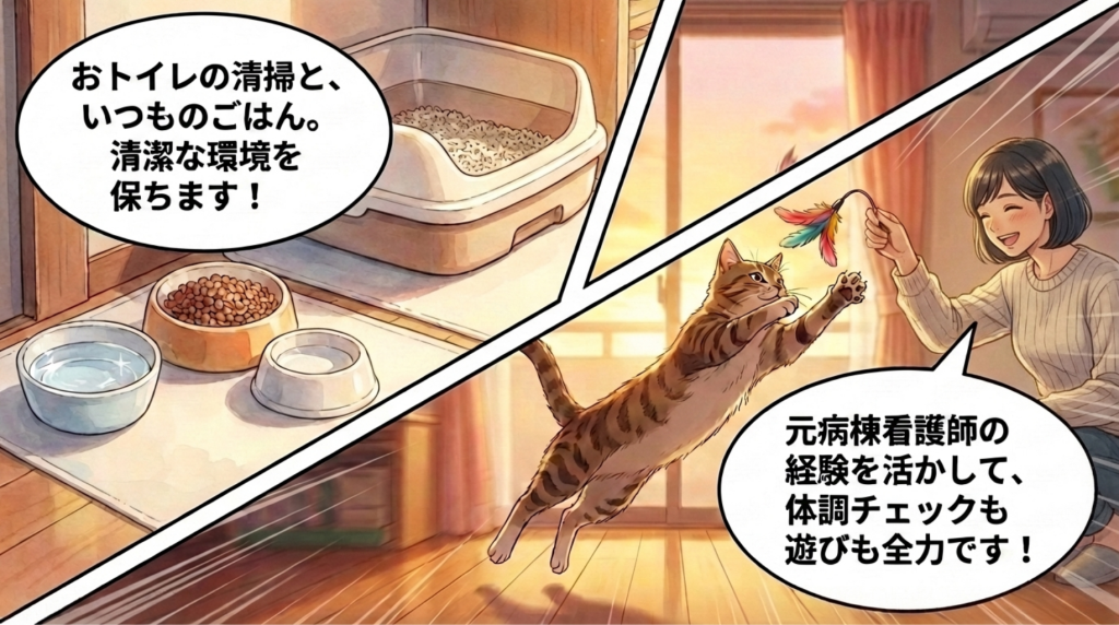 いつもの食事量、時間に合わせて新鮮な食事と水を交換します。猫ちゃんの体調に合わせた食事の調整も可能です。清潔な環境を保つため、トイレとその周辺を丁寧に清掃します。