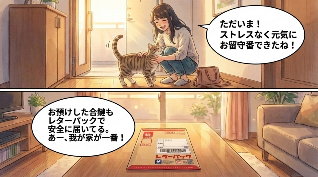 ・帰宅後にLINEでご連絡いただきしだい、郵送(レターパック)により合鍵をご返却いたします。