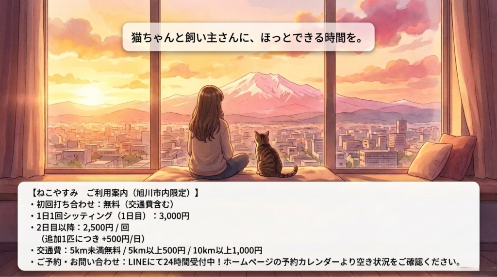 旭川で愛猫ちゃんと飼い主様の笑顔のために、心を込めてお手伝いさせていただきます。