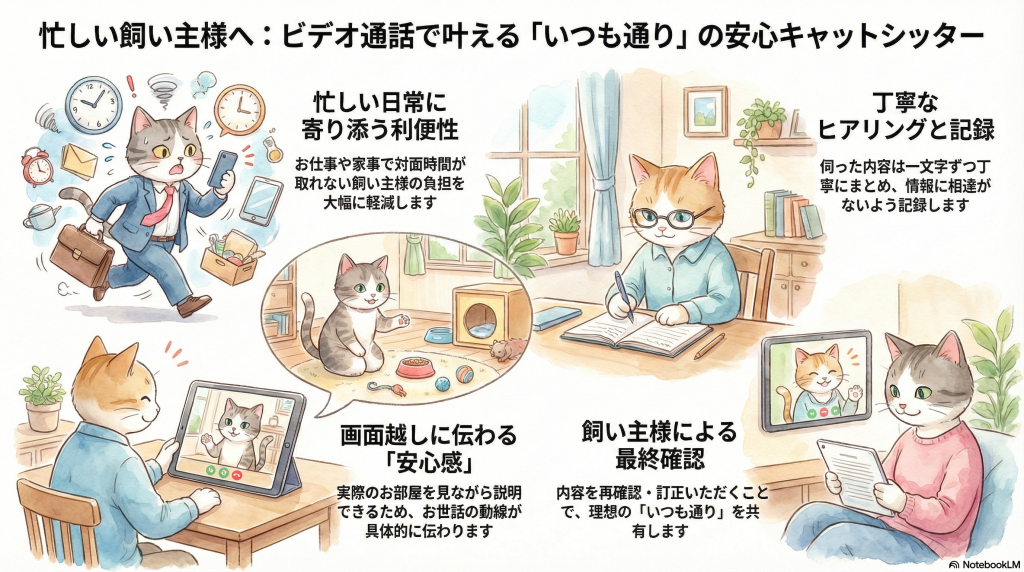 「お仕事や家事で忙しくて、なかなか対面の打ち合わせ時間がとれない……」 そんな飼い主様のご負担を減らすための一つの選択肢として、とても心強い手段だと実感しました。