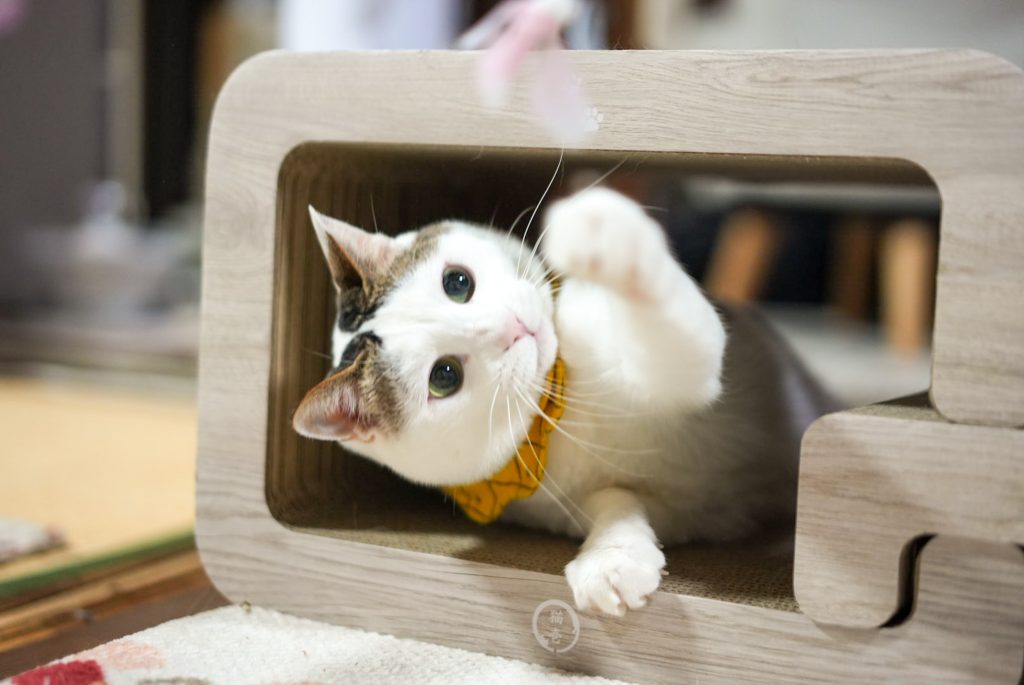 そんな様子を後ろからじーっと見つめる、最年長のとらじちゃん。 「僕も遊びたいなぁ…」という心の声が漏れてくるような、控えめな視線がとっても愛おしくて。 とらじちゃんの方へ猫じゃらしを向けると、お気に入りの爪とぎの穴から一生懸命にお手てを伸ばして応えてくれました。