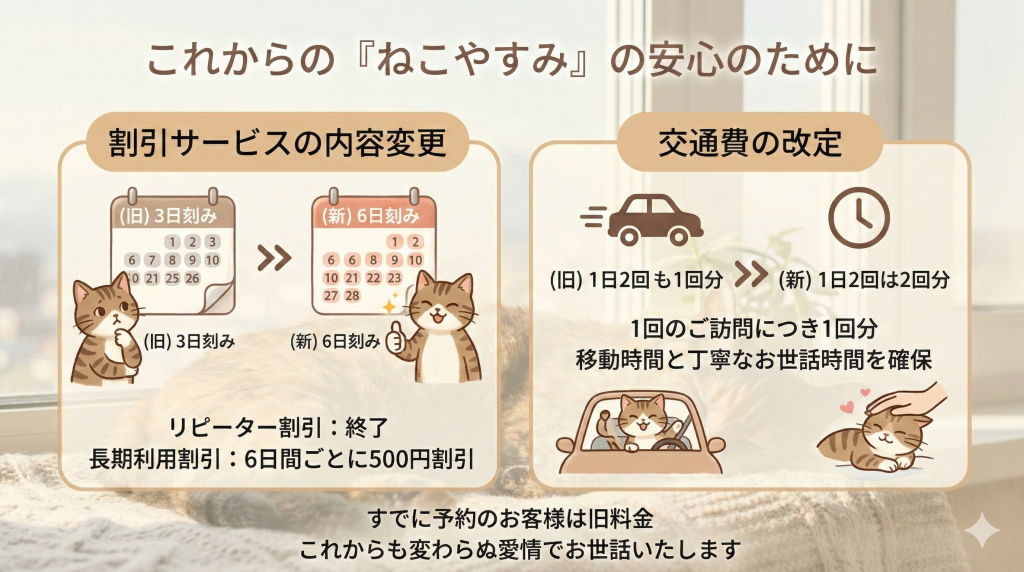 本日は、これからもあの子たちの「いつもの安心」を守り続け、より質の高いお世話を継続していくために、サービス内容の見直しに関する大切なお知らせをさせていただきます。