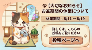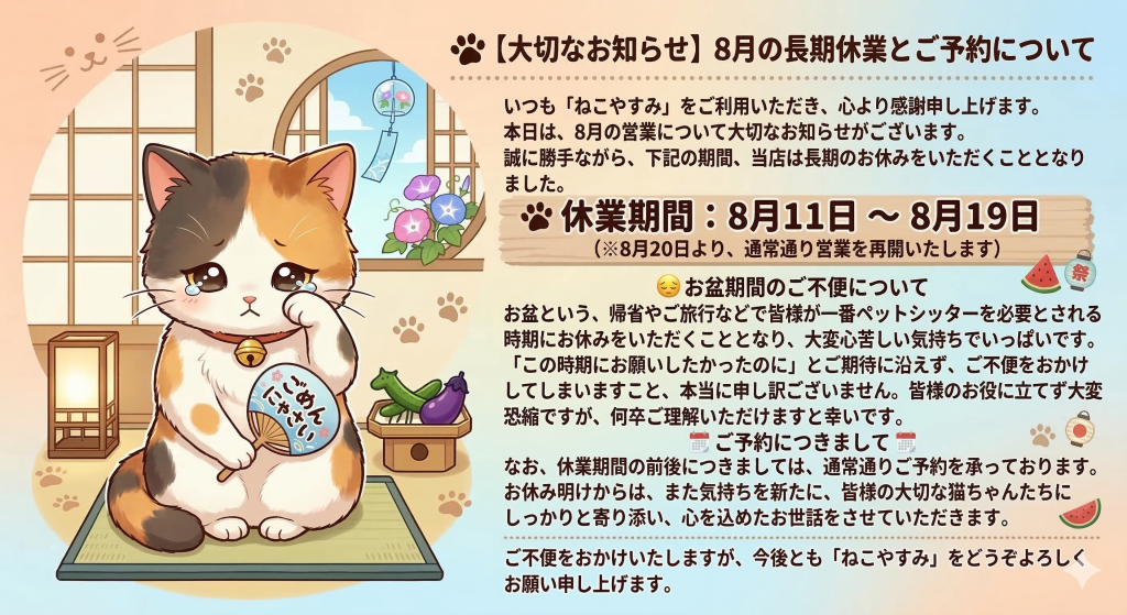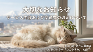 🐾 【大切なお知らせ】8月の長期休業とご予約について 3月 15, 2026 最終更新日時 : 3月 30, 2026 admin お問い合わせはこちら! 「ねこやすみ」旭川猫好きさん御用達ペットシッター