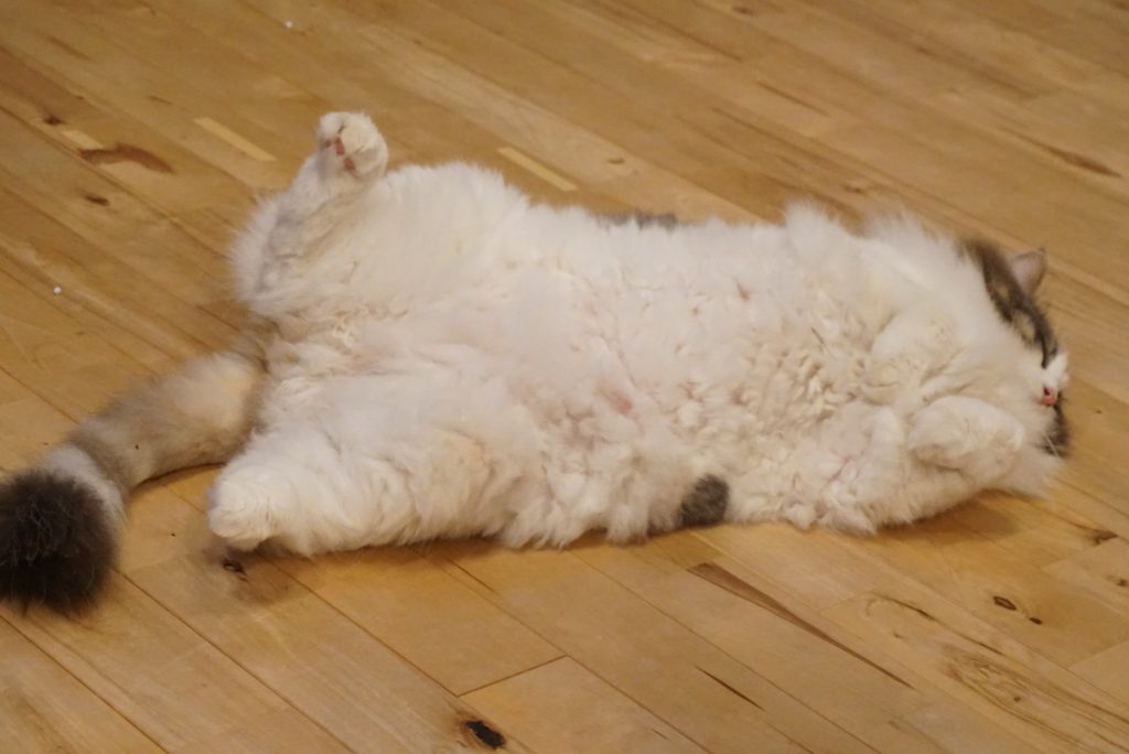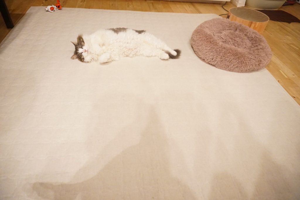 日中は、居間のど真ん中でヘソ天で寝ていることが多く、その姿はなんとも愛らしい!まるで、「ここが僕の場所だ!」と言わんばかりの堂々とした寝姿には、思わず笑ってしまいます。