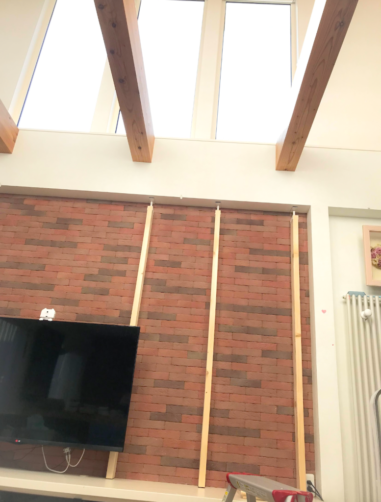 壁を傷つけずに設置できる2×4アジャスター・ラブリコ。プラスチックタイプもあるけど、アイアンで気持ちおしゃれに。電動ドリルさまさま✨️