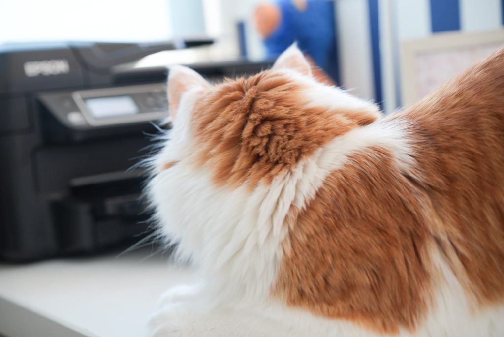 プリンターが作動するたび、よってくるチャコ。猫あるあるでしょうか?