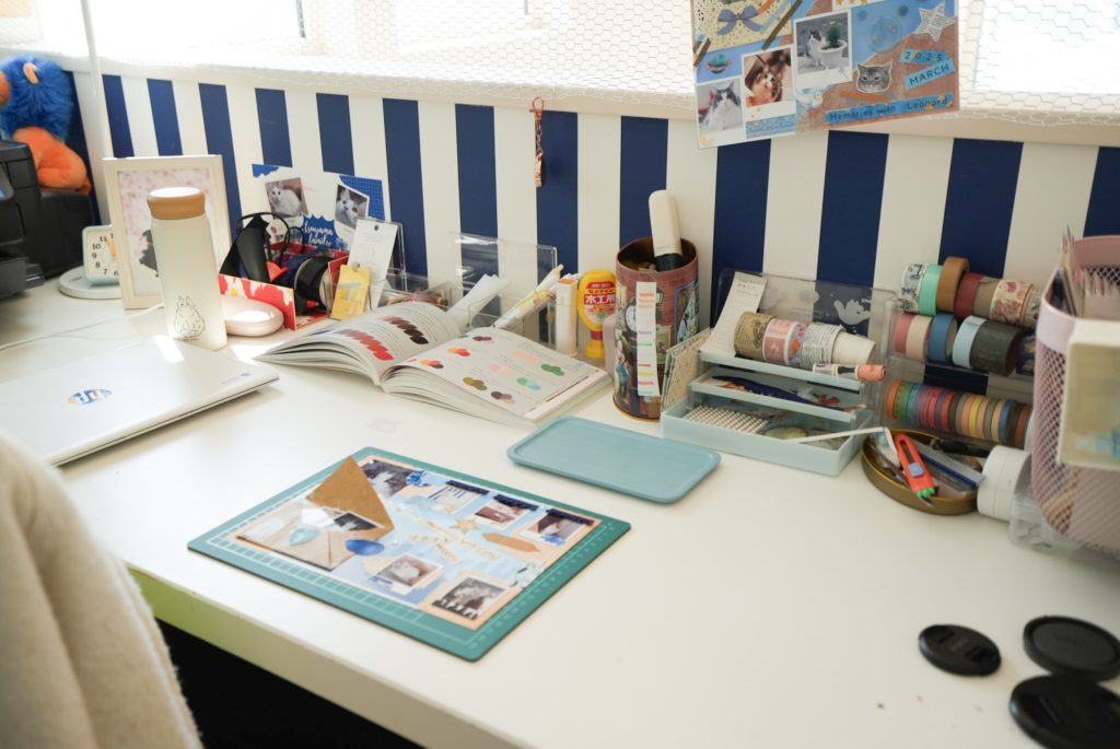 これは載せるか迷いどころの制作机。散らかっているようで本人にはどこに何があるか一目瞭然。必要なものがすぐに取り出せる、私だけの秘密基地。